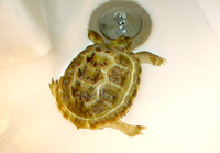 | カメの名前を決めないと。買いに行く前から、ずーっとなんて名前にしようかなあって悩んでたけど、なかなかこれという名前が思いつかなかった。なんかわかんないけど、濁点のつく名前にしたかった。延々悩んだあげく、私の好きなドラマに出てくる人の名前からとった。『デンカ』。オスかメスかわかんないけど、いいや。メスだったら『ヒデンカ』にしようかな、なんて・・・。 |